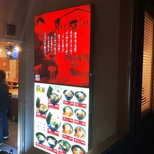 電飾看板の表示面は光を透過させる素材で作ります。乳半色のアクリル板を使うことが主流ですが、大型の内照式看板の場合はFFシートを使うことが増えてきています。夜間も営業する店舗には欠かせない看板です。