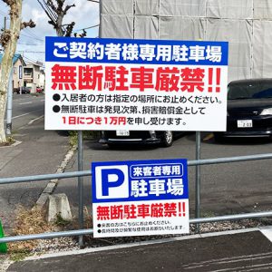 遠くからでも視認性が良い自立看板は目立つように高く、大きいサイズのものが多く使用されております。駐車場などで注意書きを掲示する場合には野立て看板としてその場所に合わせたサイズをご提案致します。